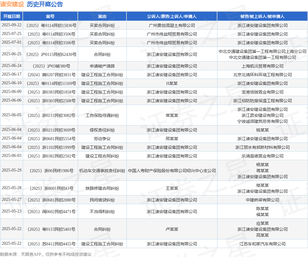 案号:(2025)粤0114民初11169号审理法院:广州市花都区人民法院案由:建设工程施工合同纠纷当事人信息: 原告/上诉人:H某某 被告/被上诉人:浙江诸安建设集团有限公司开庭日期:2025年6月10日根据统计,近一年内以浙江诸安建设集团有限公司为当事人的历史开庭公告有167则,其中案由为“建设工程施工合同纠纷”的公告以37则居首,其次为“建设工程分包合同纠纷”有30则,“买卖合同纠纷”有29则。历史开庭公告(前20条)如下:
